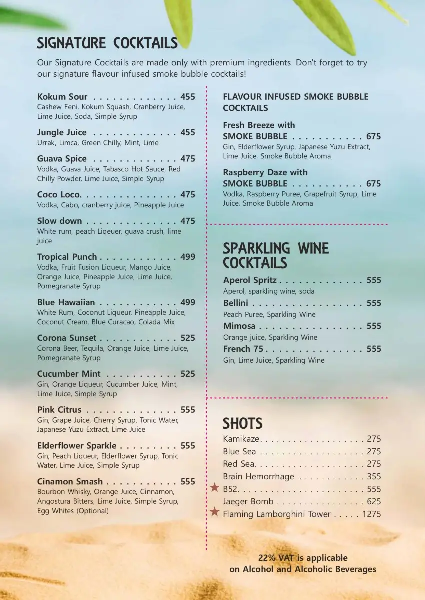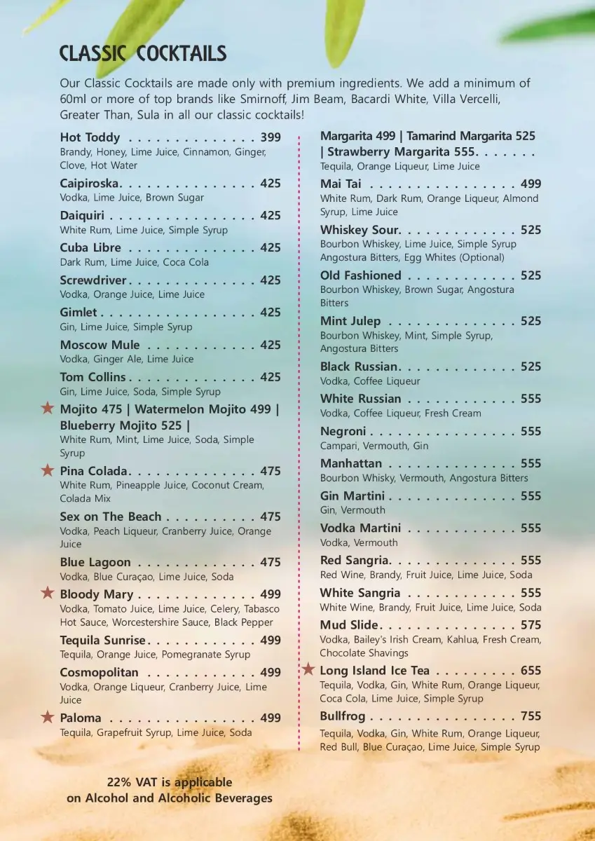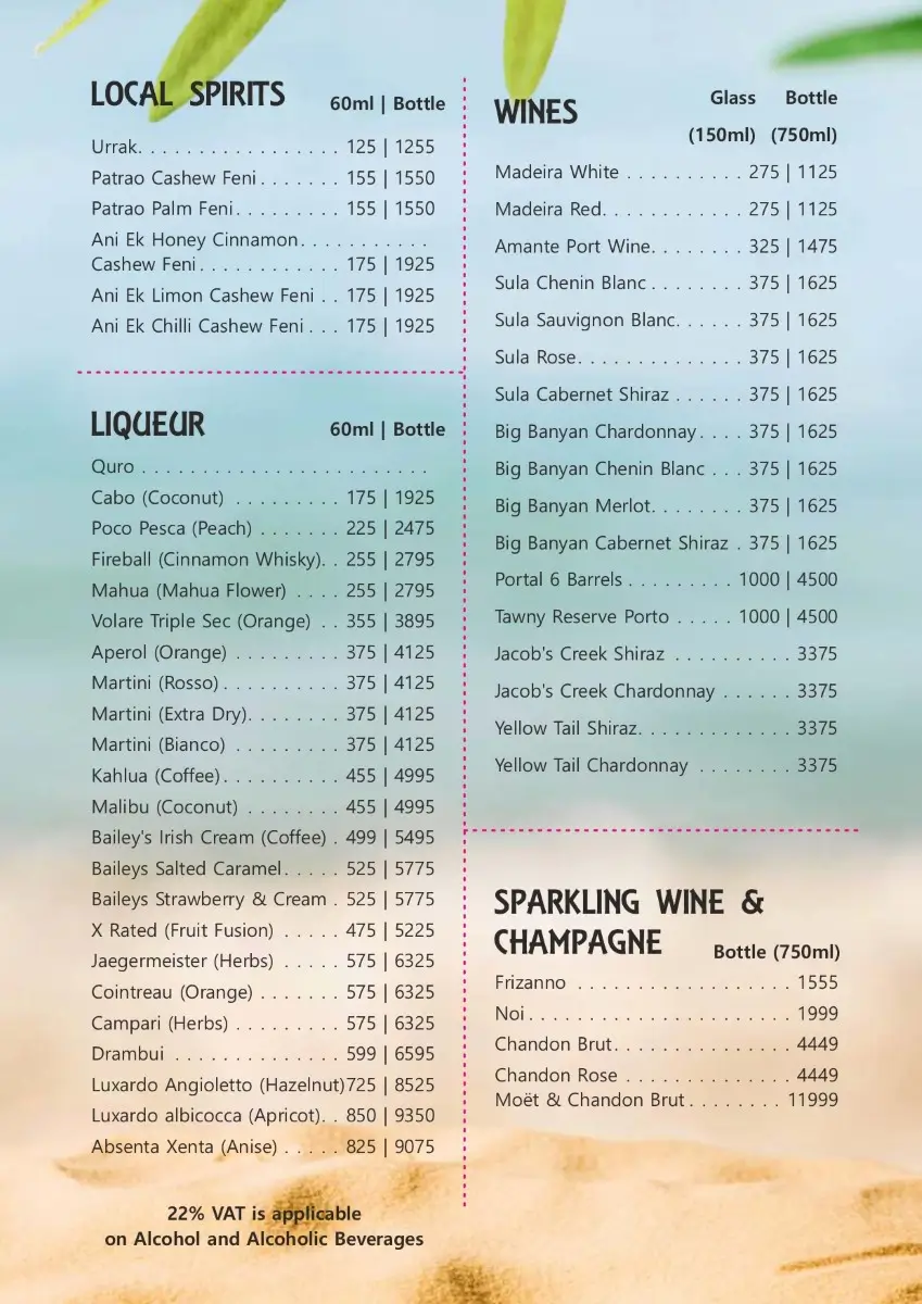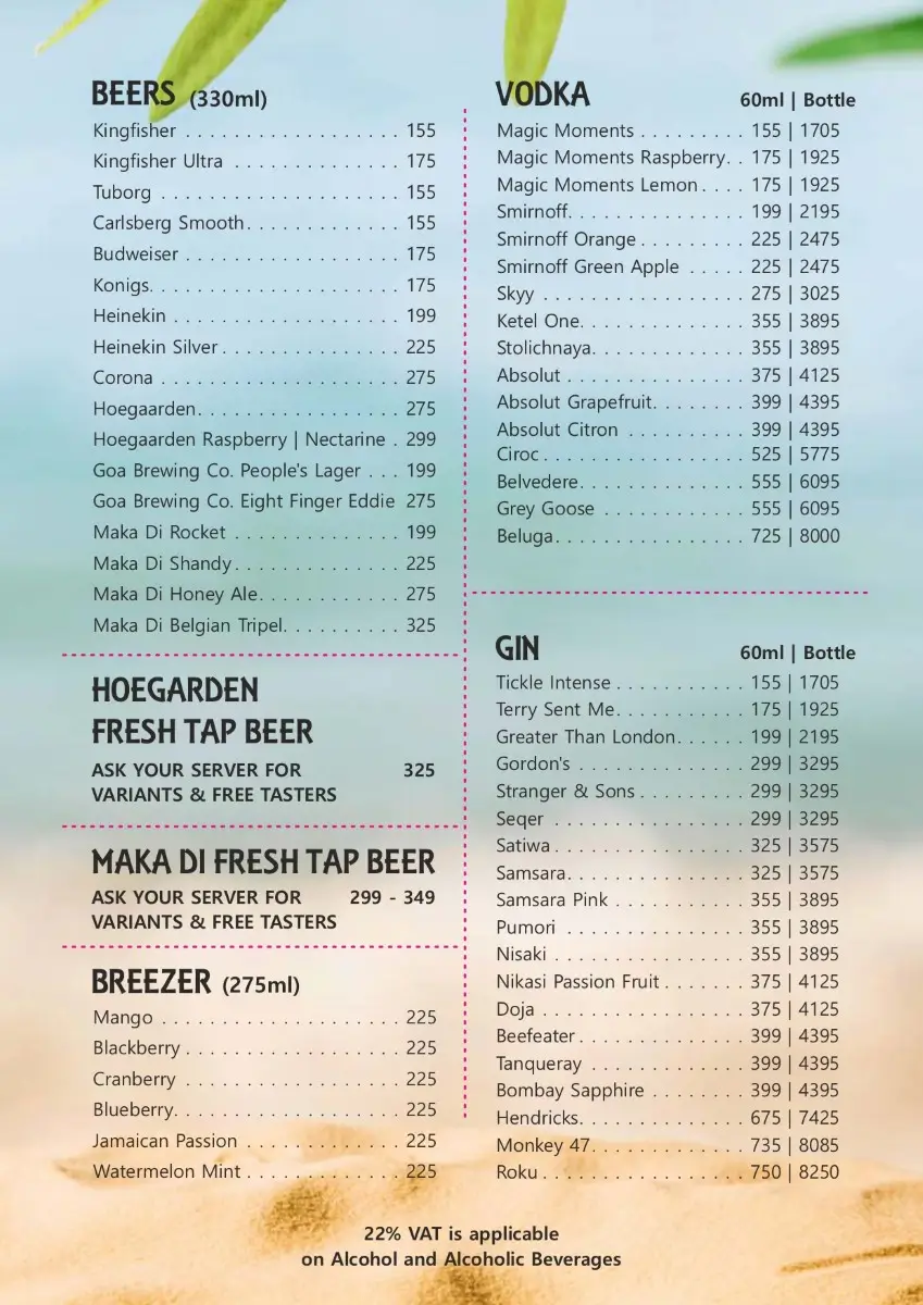 Some drinks just hit differently by the sea—especially at one of the best restaurants in Candolim, North Goa. Whether it’s a cocktail made for golden hour, a crisp local brew, or your go-to classic, our beachside bar and restaurant in Candolim, North Goa is all about easygoing vibes, bold flavours, and ocean views that never get old. Take a look at our menu and find your perfect sip—because some moments are best enjoyed with a drink in hand.